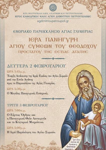 Η ενορία του Αγίου Δημητρίου Πετρουπόλεως πανηγυρίζει την εορτή του Αγίου Συμεών του θεοδόχου, προστάτου της ενοριακής Εστίας Αγάπης, η οποία συνεχίζει να προσφέρει πολλά στους ενδεείς κατοίκους της περιοχής.