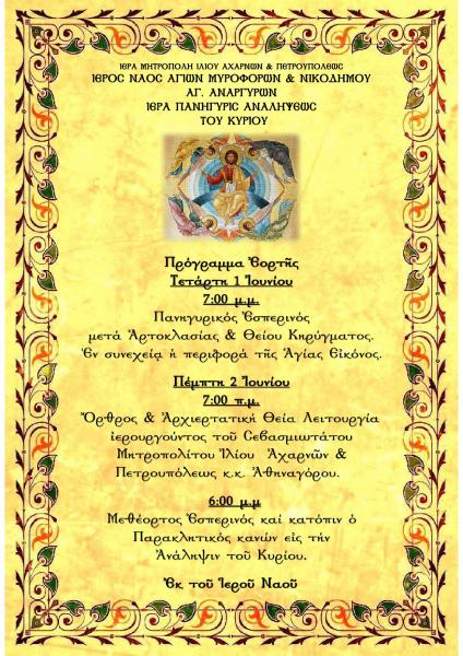 Κατά την εορτή της Αναλήψεως του Κυρίου εορτάζει την δεύτερη πανήγυρή της η ενορία των Αγίων Μυροφόρων και Νικοδήμου. Το πρόγραμμα ακολουθιών είναι το ακόλουθο: