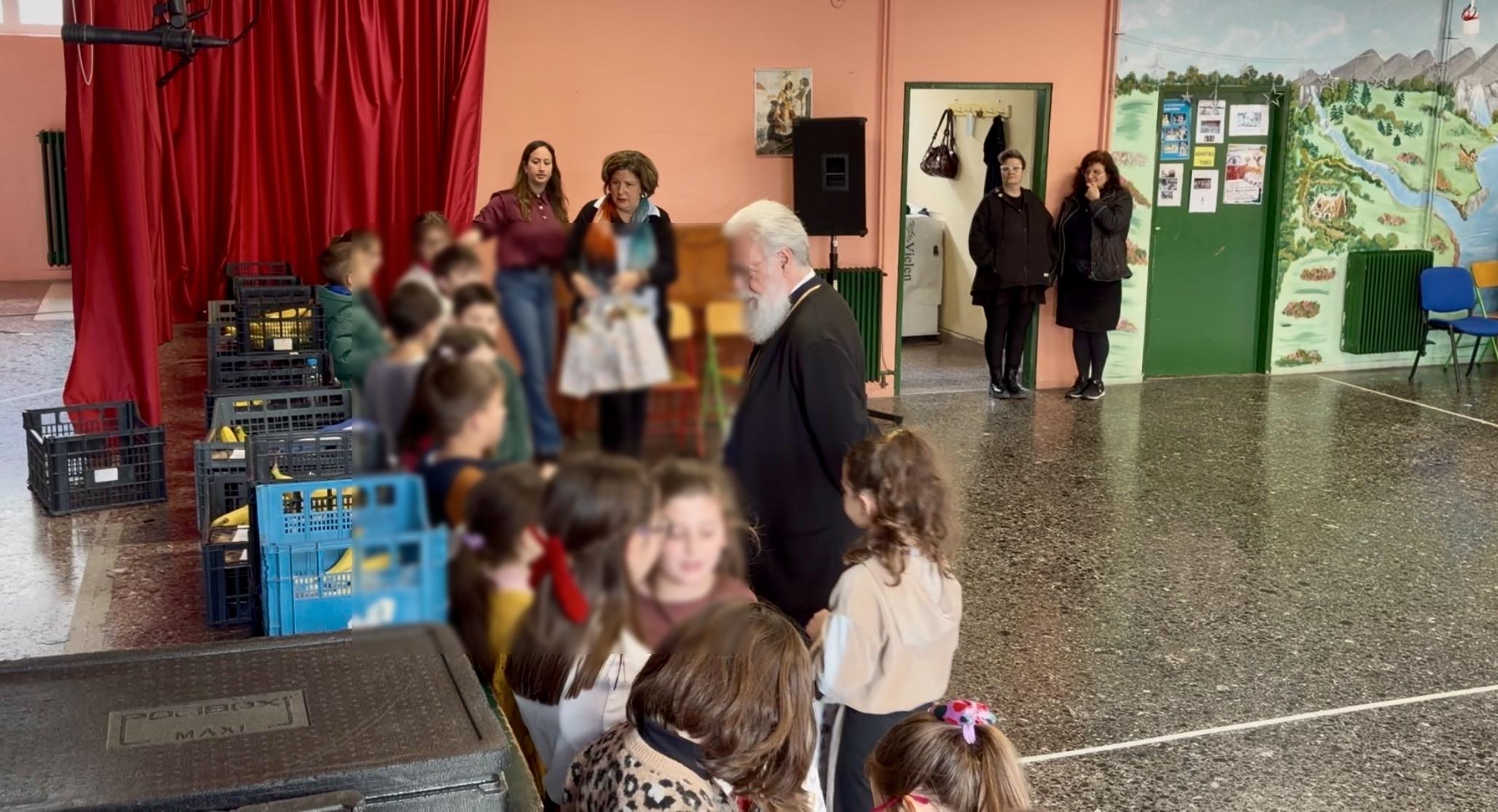 Ακολούθησε ανάγνωση ενός ιδιαίτερα επίκαιρου μηνύματος από τα παιδιά, που μεταξύ άλλων ανέφερε: «Μαζί με την αναστάσιμη λαμπάδα να ανάψουμε την ελπίδα για ένα καλύτερο αύριο», ενώ στο τέλος ευχήθηκαν όλα μαζί: «Σας ευχόμαστε Καλό Πάσχα, με υγεία, αγάπη και ειρήνη σε όλο τον κόσμο». Στη συνέχεια, δώρισαν στον Σεβασμιώτατο ένα όμορφο καλάθι με παραδοσιακά κουλούρια - λαζαράκια (γνωστά και ως λαζαρίτσες), που είχαν φτιάξει οι μαθητές με τους γονείς τους.