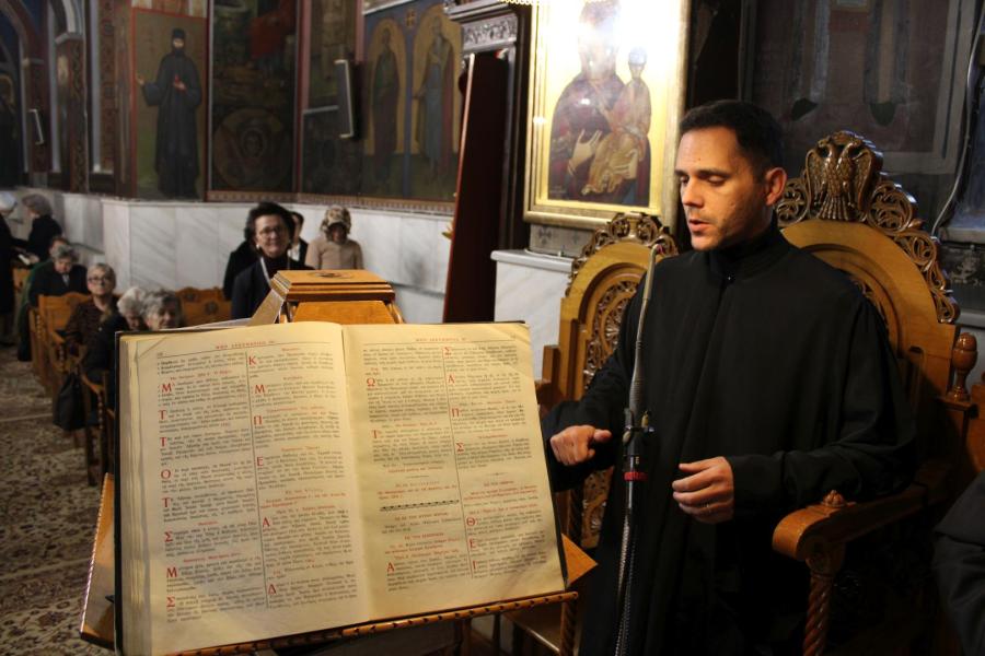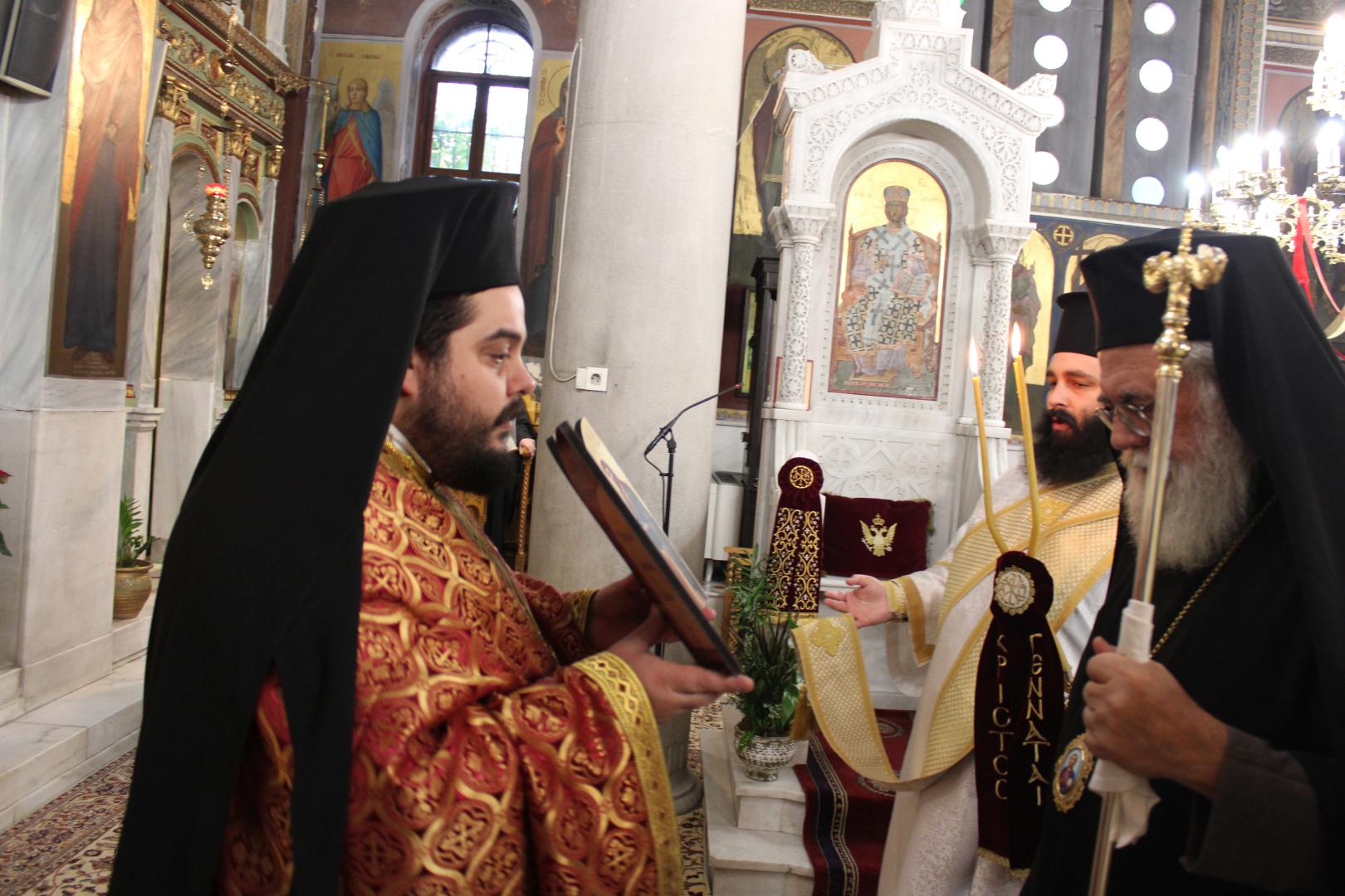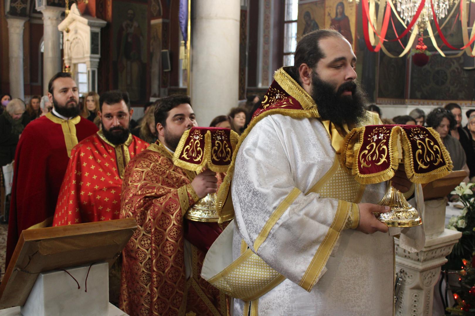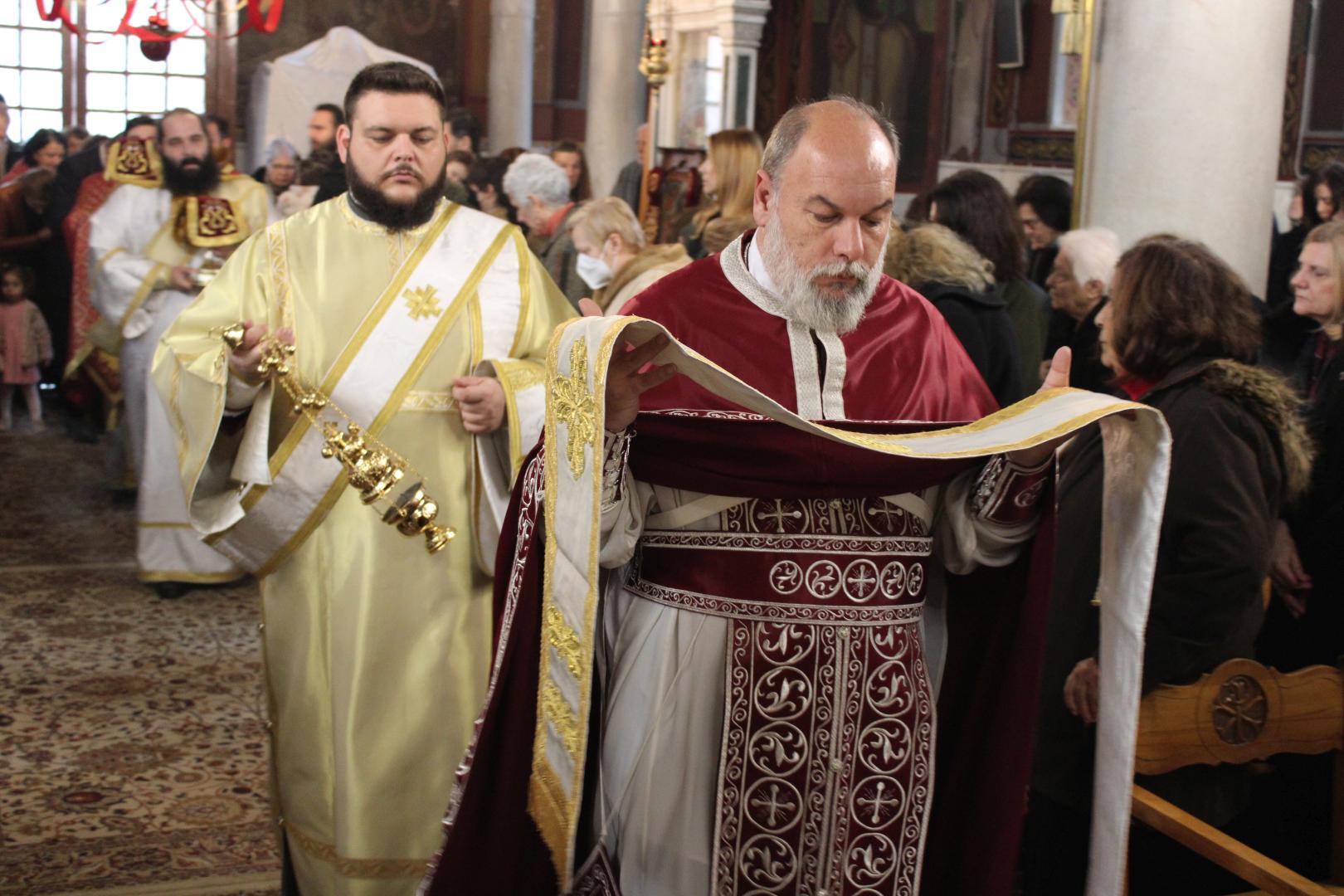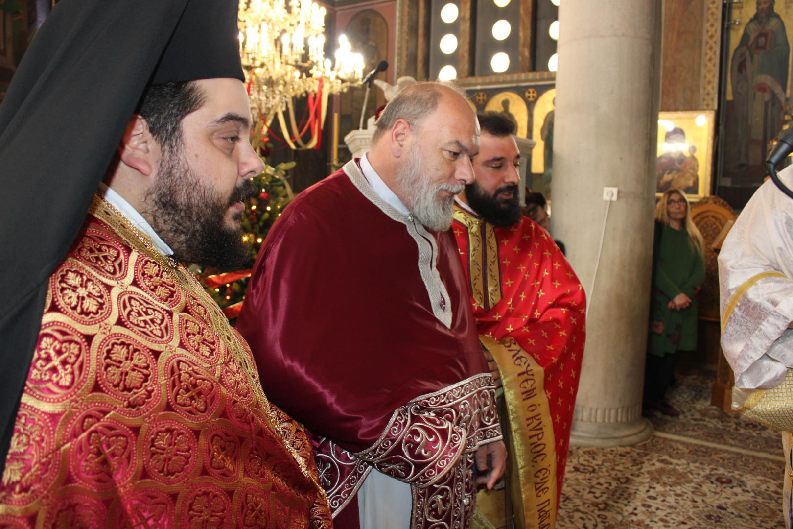 συμπαραστατούμενος από τους π. Μιχαήλ Γιαννακέλο, Πρόεδρο του Εκκλ. Συμβουλίου του Ιερού Ναού, τους συνεφημερίους του π. Γεώργιο Χαλκιά, π. Μιχαήλ Καρ και π. Νεκτάριο Τριβέλλα και τους διακόνους του π. Άγγελο Μιχαλόπουλο και π. Καλλίνικο Ζωγράφο.