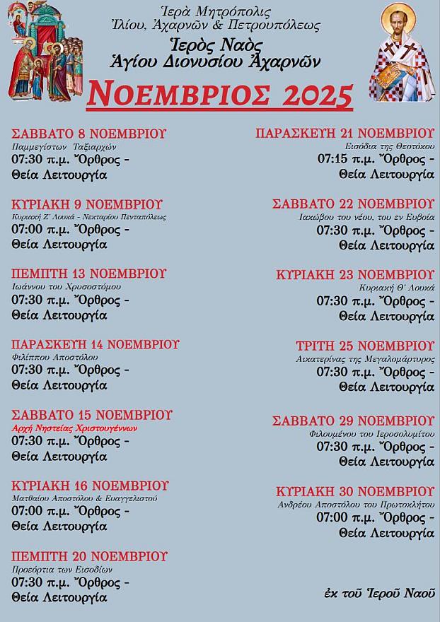 Πρόγραμμα ακολουθιών Νοεμβρίου 2025 ενορίας Αγίου Διονυσίου Αχαρνών