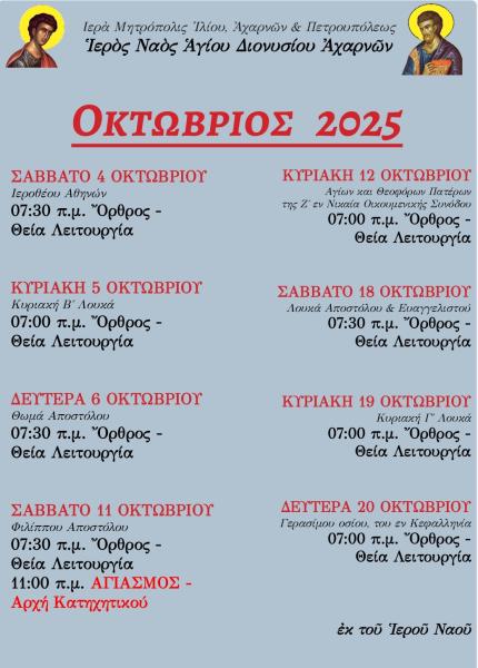 Πρόγραμμα ακολουθιών Οκτωβρίου 2025 ενορίας Αγ. Διονυσίου Αχαρνών