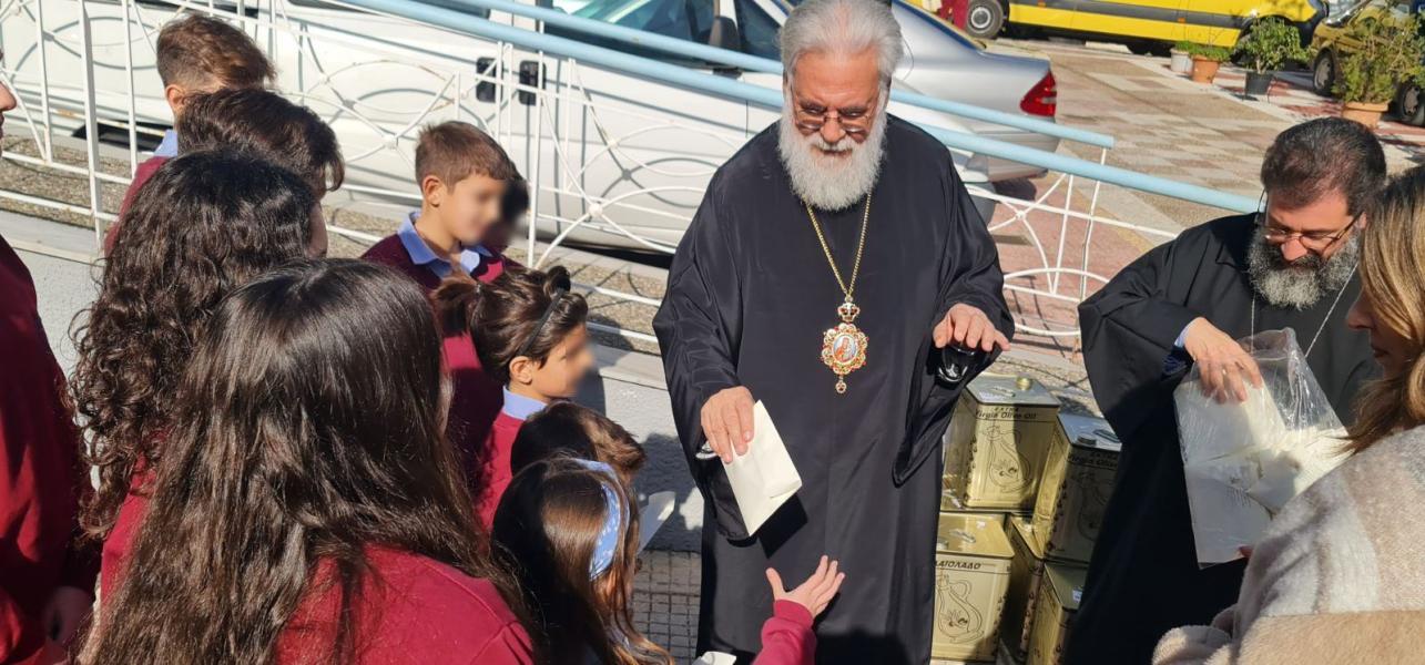 Οι μαθητές, συνοδευόμενοι από τη Διευθύντρια του Δημοτικού Σχολείου, κα Ζαχοπούλου, προσήλθαν στη Μητρόπολη προκειμένου να προσφέρουν ελαιόλαδο, το οποίο συγκέντρωσαν στο πλαίσιο καθιερωμένης, τα τελευταία έτη, δράσης του σχολείου τους, με σκοπό τη στήριξη συνανθρώπων μας που αντιμετωπίζουν δυσκολίες.
