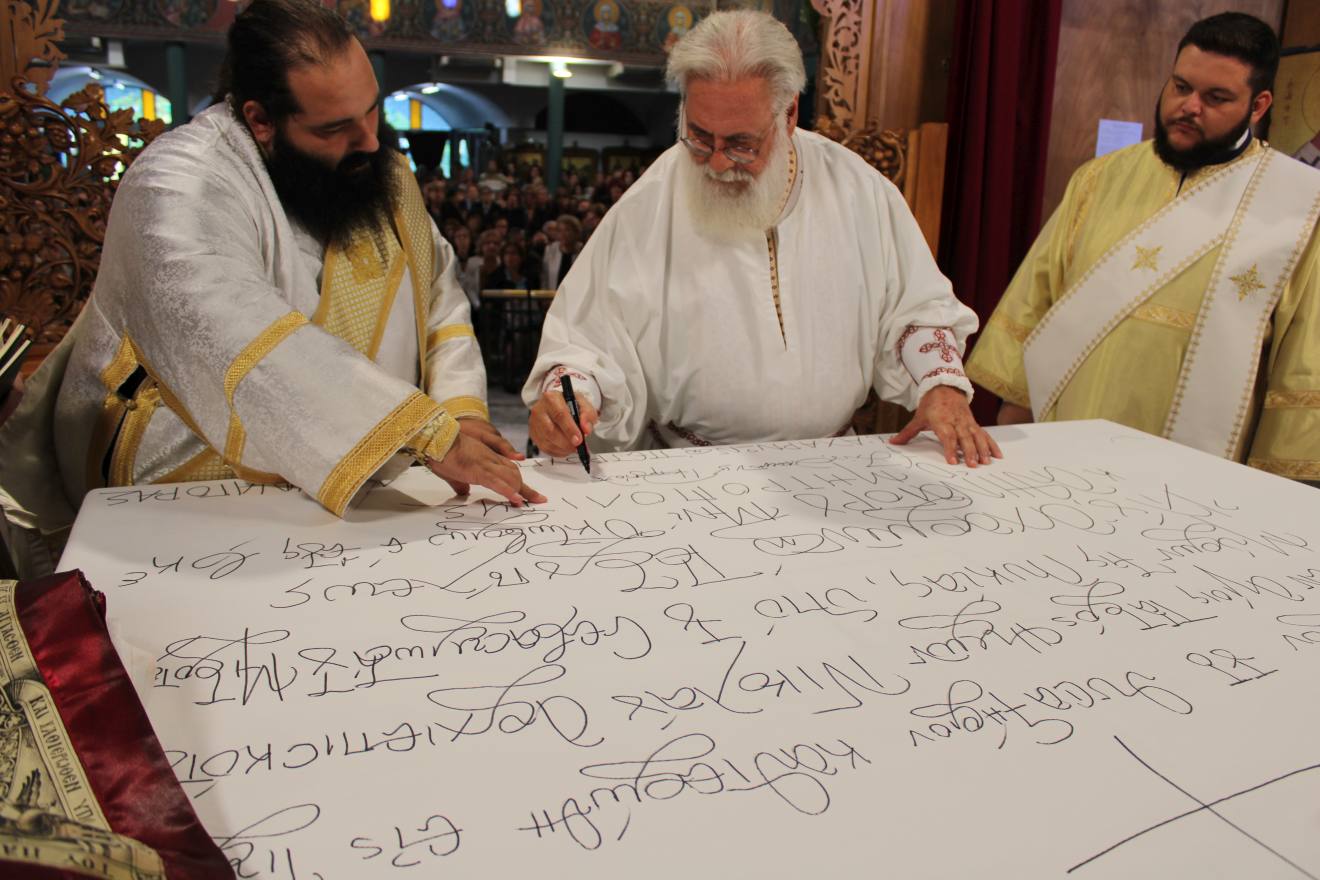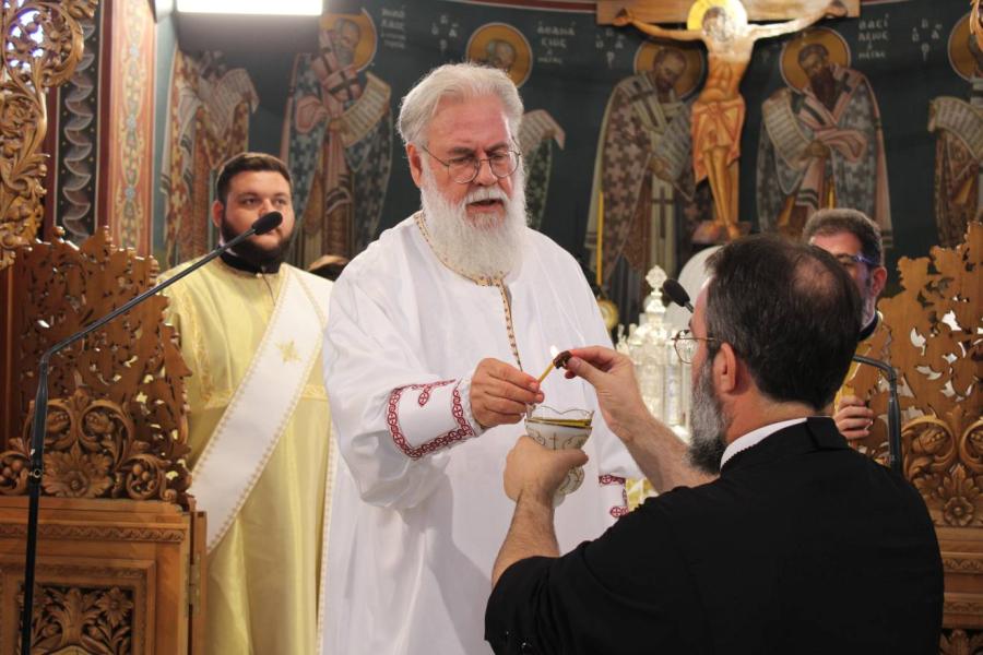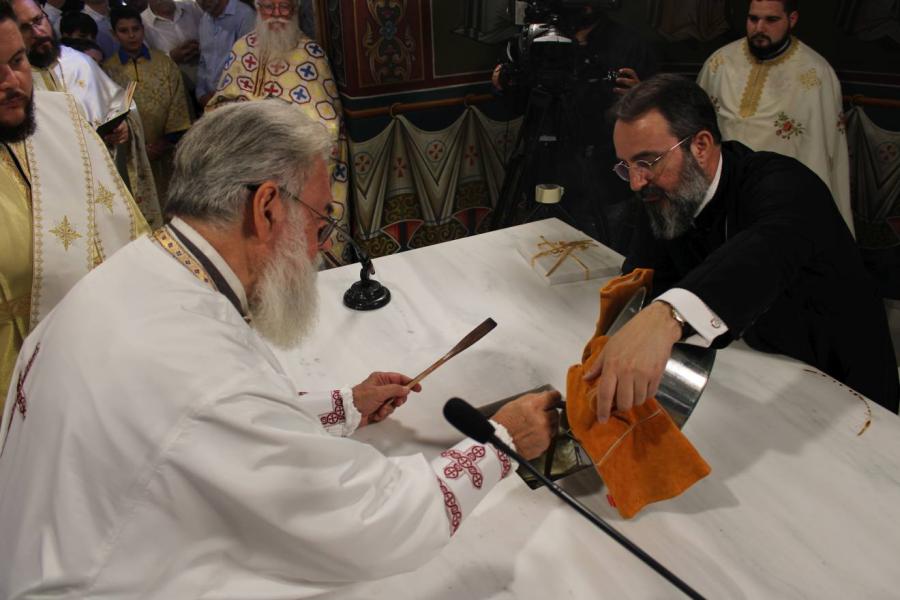 Στο τέλος της λειτουργίας ο Σεβασμιώτατος βοηθούμενος από τους ιερείς, διένειμε το αντίδωρο και το ενθύμιο των εγκαινίων στη πληθύ των πιστών που παρευρέθησαν στον Ιερό Ναό.