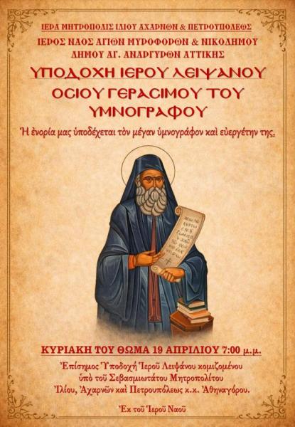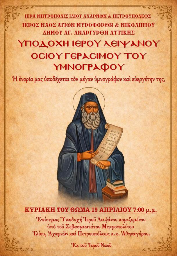 Η ενορία Αγίων Μυροφόρων και Νικοδήμου υποδέχεται ιερό λείψανο του μεγάλου υμνογράφου και ευεργέτη της, Αγίου Γερασίμου Μικραγιαννανίτου, την Κυριακή του Θωμά, 19 Απριλίου 2026, στις 19:00.